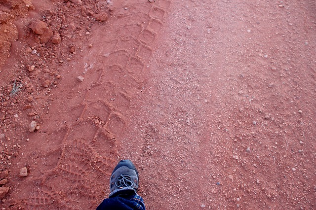 とんでもない道だった。路盤は固く、非常にバンピー。雨で流されてきたと思われる赤い砂が、表面に波模様を描き、砂を堅くプレスしたような下地を覆い隠している。